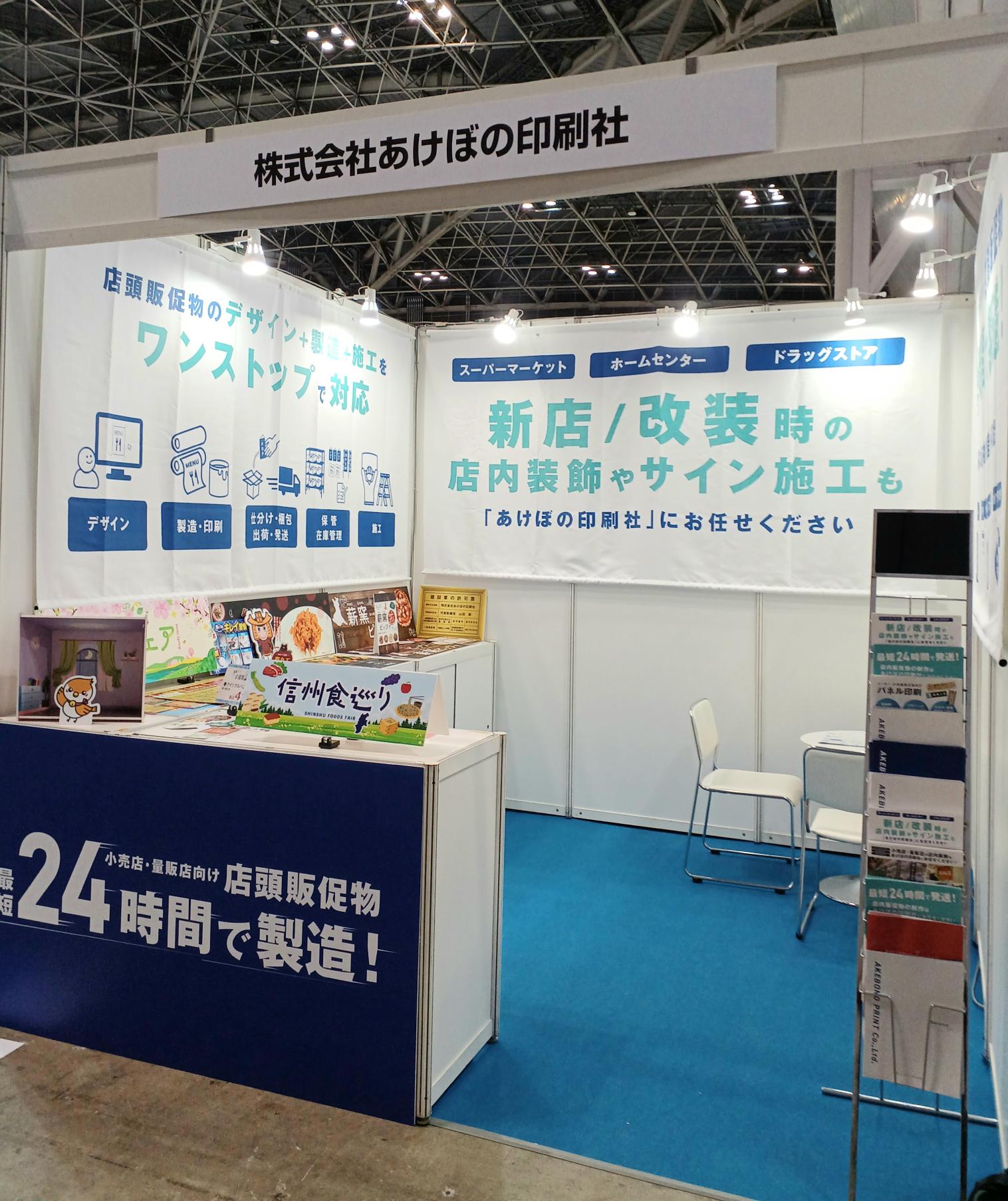今回の展示会では、スーパーマーケット・ホームセンター・ドラッグストアなどの小売店の企業様向けに、“新店/改装時の店内装飾やサイン施工も、「あけぼの印刷社にお任せください」”というテーマで出展いたしました。